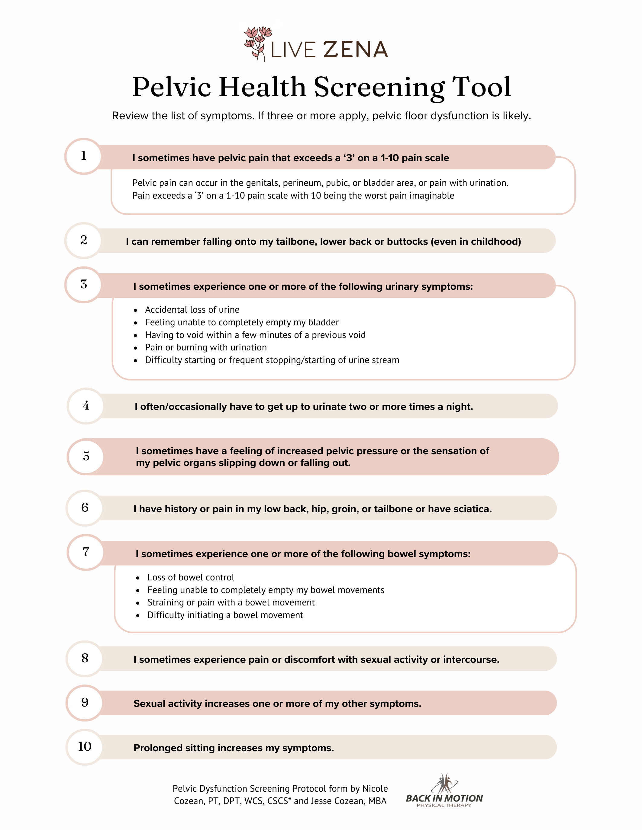 This quick (free) screening tool below, originally developed by Nicole Cozean and Jesse Cozean, helps identify possible pelvic floor dysfunction symptoms. While it is not a diagnostic test, it can provide valuable insight into whether further evaluation may be beneficial.